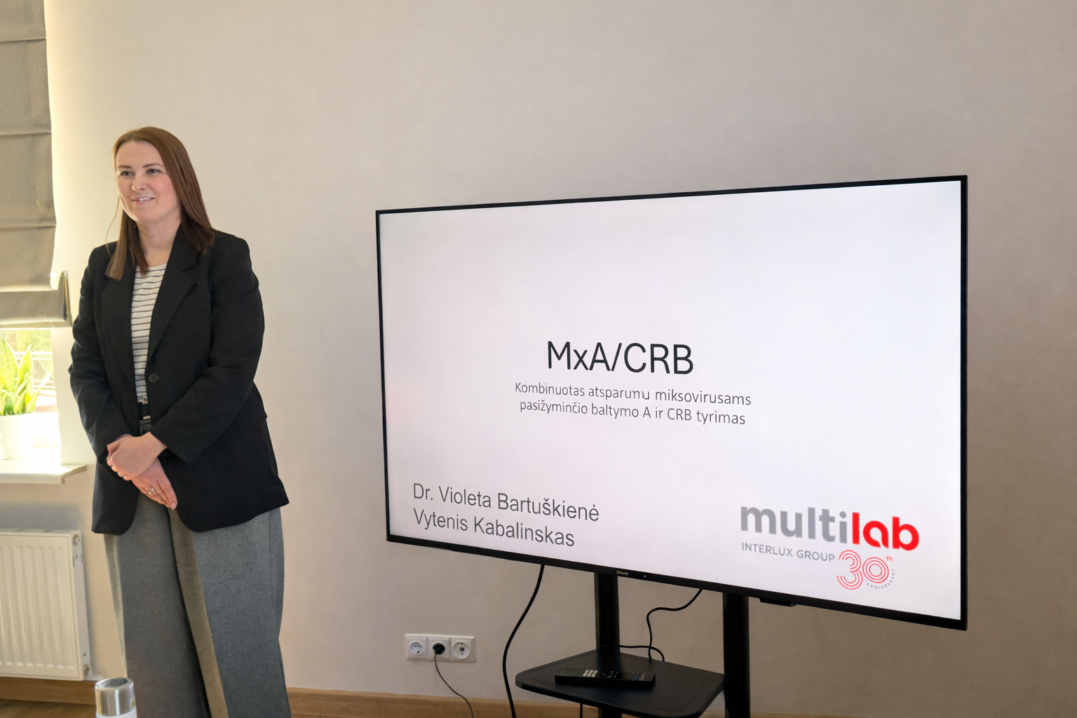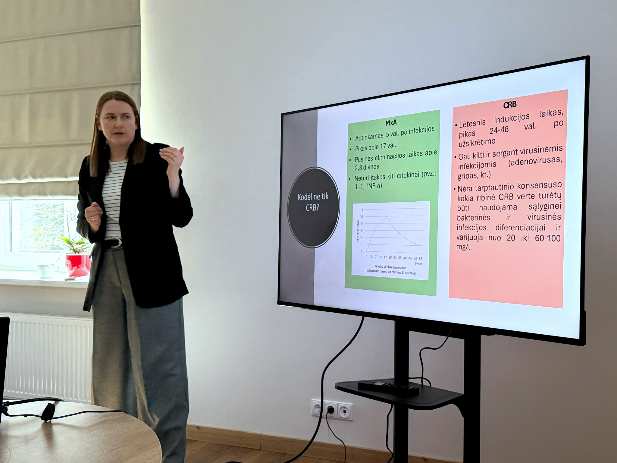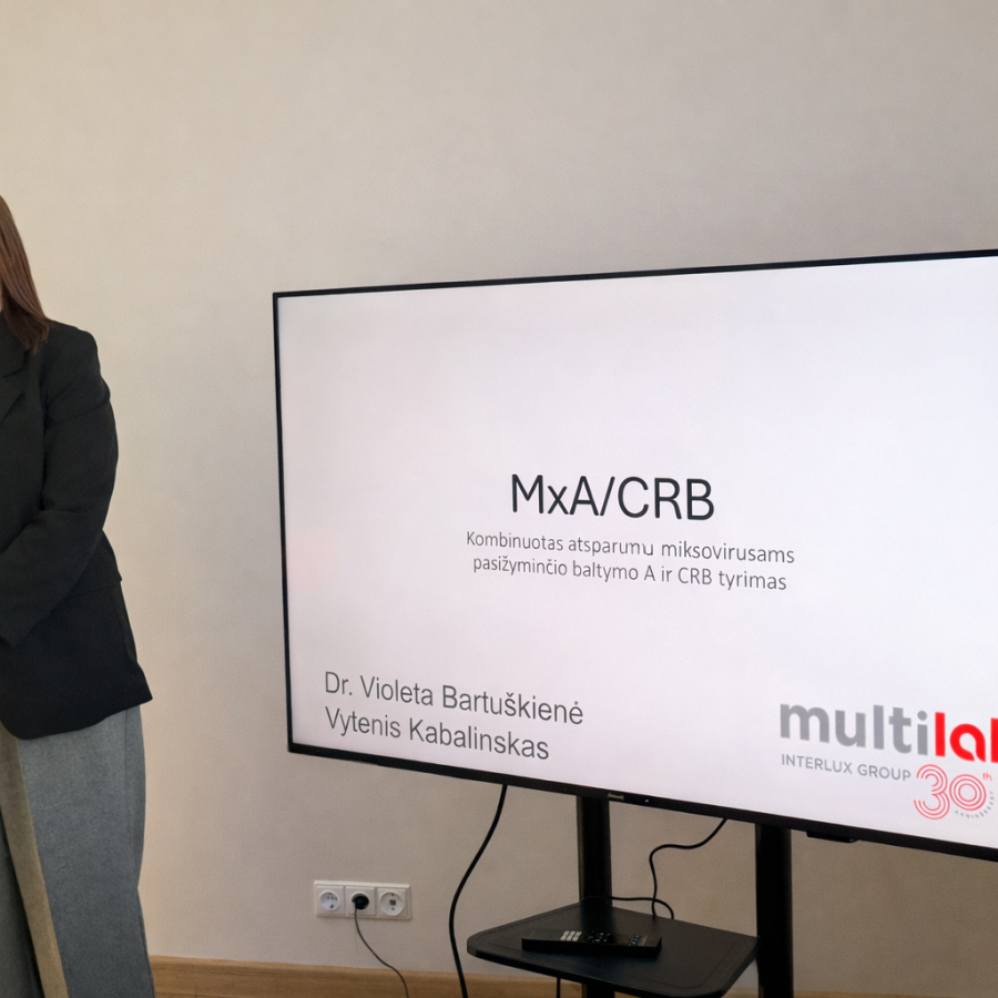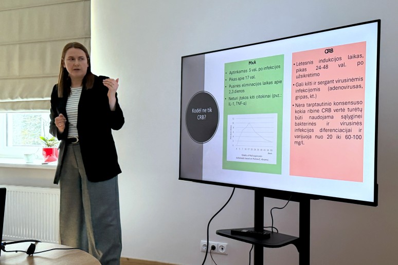 Pirmąjį pranešimą skaitė dr. Violeta Bartuškienė, pristačiusi MxA/CRB tyrimą, padedantį tiksliau atskirti virusinę ir bakterinę infekciją. Kaip akcentuota pristatymo metu, šis tyrimas iš vieno mėginio leidžia gauti du rodiklius, kurie gali padėti gydytojui priimti objektyvesnį sprendimą dėl gydymo taktikos ir antibiotikų skyrimo. Taip pat pabrėžta, kad tokie diagnostiniai sprendimai svarbūs siekiant mažinti perteklinį antibiotikų vartojimą ir antimikrobinio atsparumo problemą. Sveikatos centras šį tyrimą ateityje taip pat ketina įsidiegti savo praktikoje.